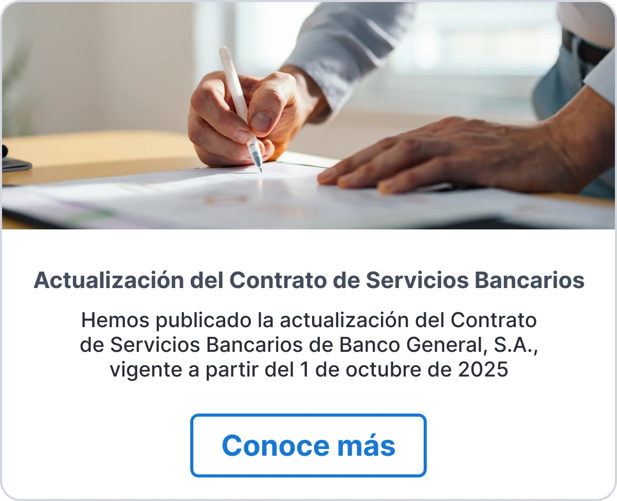 Hemos publicado la actualización del Contrato de Servicios Bancarios de Banco General, S.A., vigente a partir del 1 de octubre de 2025, que contiene nuevas cláusulas y algunas modificaciones a las ya existentes.